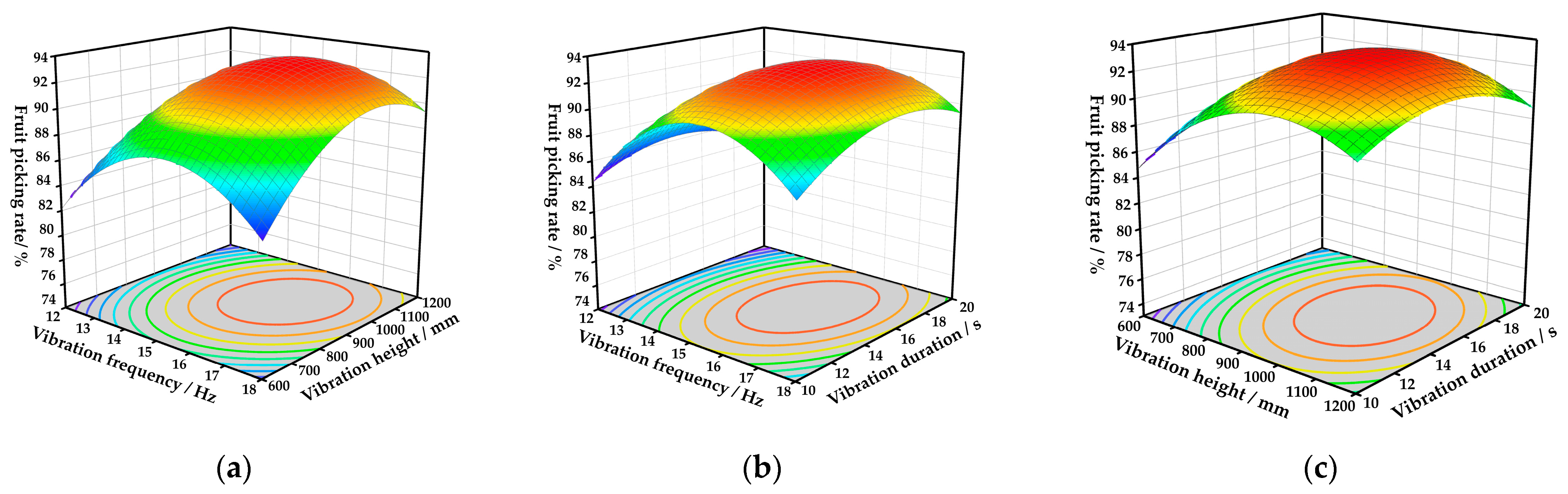 - The experimental results were optimized using the Response Optimization module in Design-Expert. The optimal parameter combination for the handheld CO vibration harvesting device was determined to be: vibration frequency of 14 Hz, vibration height of 980 mm, and vibration duration of 13 s. Under these conditions, the fruit-picking efficiency reached 95.22%, demonstrating an ideal harvesting performance that meets the requirements for CO fruit harvesting.