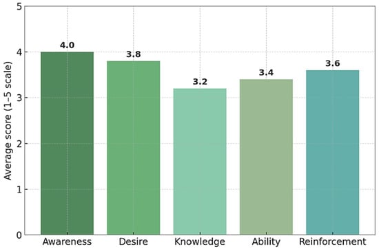 The descriptive analysis showed that there were clear variations between the different components of the ADKAR model across the surveyed farms. Among these, Awareness, the understanding of the need for change, recorded the highest average values, reaching roughly 4.0 ± 0.5 on a scale from 1 to 5. This suggests that most farm managers are well informed about the importance of sustainability and understand both the regulatory and market pressures that increasingly require farms to adopt more responsible production methods. Only a small share of respondents, around 15%, scored 3 or lower, reflecting limited understanding or a weaker perception of the urgency for change.