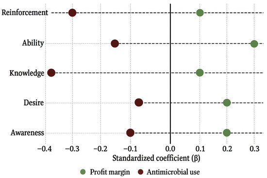 Multiple regression analysis. To investigate the potential predictive relationships more deeply, two multiple linear regression models were developed. In the first, profit margin was the dependent variable, while the five ADKAR dimensions were used as predictors, with farm size included as a control variable. The goal was to determine which specific components of change readiness had the strongest influence on financial performance. In the second model, antimicrobial use (log-transformed for normalization) served as the dependent variable, again with the ADKAR dimensions as predictors and farm size controlled.