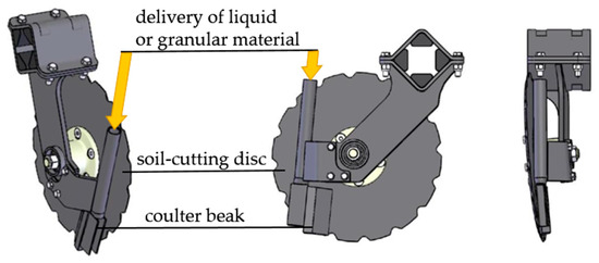 Considering its intended use on small, family-owned organic farms with limited investment potential, the design emphasized simplicity, low cost, and ease of maintenance. Therefore the applicator employs heavy disc coulters from a Fenix-G grass seed drill (Unia Sp. z o.o., Grudziądz, Poland) integrating the soil-cutting disc with a coulter that introduces either liquid or granular material into the soil (Figure 1). The robust structure of the coulters allows cutting through crusted or compacted soil layers typically found in interrows of perennial crops such as strawberries and introducing the bioproduct below the surface without depositing it on top of the soil. The furrow formed behind the coulter is very narrow (approximately 3 cm) and does not require closure by an additional device, ensuring minimal soil disturbance and structural simplicity.