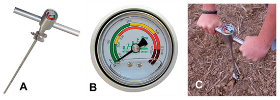The measurements were performed according to the ASABE Standard S313.3 [46] using a portable manual cone penetrometer (Soil Compaction Tester, STEP Systems GmbH, Nürnberg, Germany) (Figure 6) that provides a qualitative estimation of soil firmness by measuring the mechanical resistance of the soil to cone penetration. The instrument consisted of a graduated steel rod with a 13 mm conical tip and an analog pressure gauge displaying penetration resistance as pressure expressed in pounds per square inch (PSI), convertible to MPa. During measurement, the probe was manually inserted into the soil to a maximum depth of 50 cm, and readings were recorded at 5 cm intervals corresponding to the marked graduations on the rod.