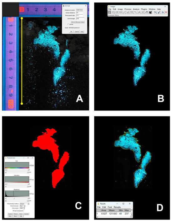 Steps of UV image analysis performed using the ImageJ application: (A) scale setting on raw image; (B) retouching: manual removal of artifacts; (C) object segmentation based on manual thresholding; (D) determining area of the segmented (fluorescent) object.
