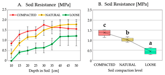 Soil resistance (MPa) on three experimental plots with compaction levels defined as COMPACTED, NATURAL, and LOOSE: (A) mean values with standard deviation bars of soil resistance measured using a manual cone penetrometer (13 mm cone tip) to a depth of 50 cm; (B) mean values based on records taken every 5 cm from 10 to 30 cm soil depth. Means labelled by the same letter do not differ significantly according to Duncan’s multiple range test (p < 0.05).