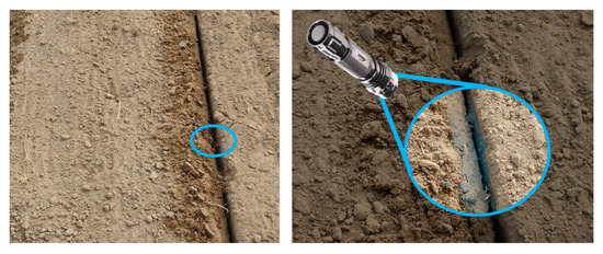 Following the preparation of experimental plots with different soil compaction levels, the liquid material in form of 2% aqueous solution of fluorescent tracer UView (METOS by PESSL Instruments, Weiz, Austria) was applied using two alternative application methods (Figure 3): (1) on-surface application with a high-flow, narrow-angle TeeJet nozzle TPU #60JET SS 4060 (Spraying Systems Co., Wheaton, IL, USA) discharging the liquid onto the soil surface from a height of approximately 15 cm and thereby wetting a narrow strip of soil approximately 10 cm wide, and (2) subsurface application using the developed coulter-based applicator.