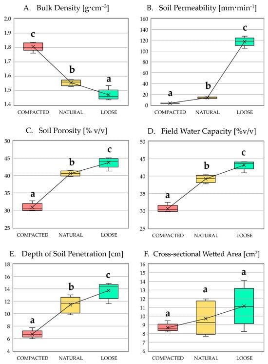 The data were statistically analyzed by software STATISTICA 13.3 (StatSoft Polska Sp. z o.o., Kraków, Poland). The analysis of variance (ANOVA), followed by Duncan’s multiple range test at a significance level of p < 0.05 was performed to separate means and detect significant differences. For each tested effect, within each soil compaction treatment, five or ten measurements were taken at spatially independent locations in the field. These locations served as true experimental replicates, ensuring independence of observations and validating the use of one-way ANOVA for treatment comparisons.