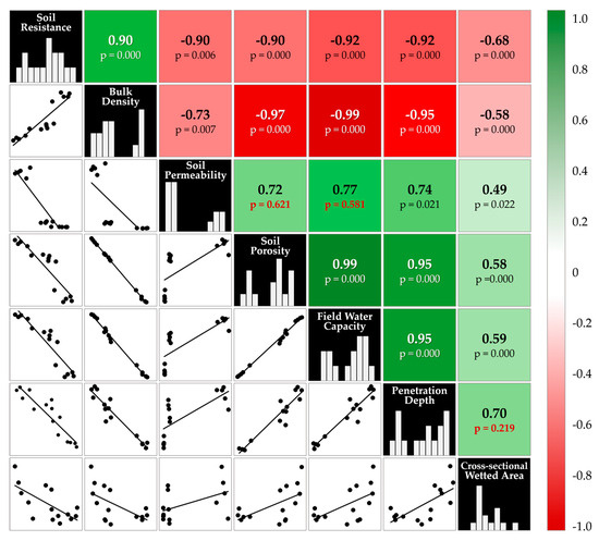 The correlation matrix provided integrative insight into the relationships among soil physical properties and liquid penetration behaviour. As expected, penetration depth was strongly positively correlated with porosity and negatively correlated with bulk density and soil resistance. These relationships confirm that soil structural properties govern the ability of the tool to reach the planted depth and the ability of the liquid to move through the pore network.