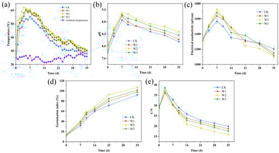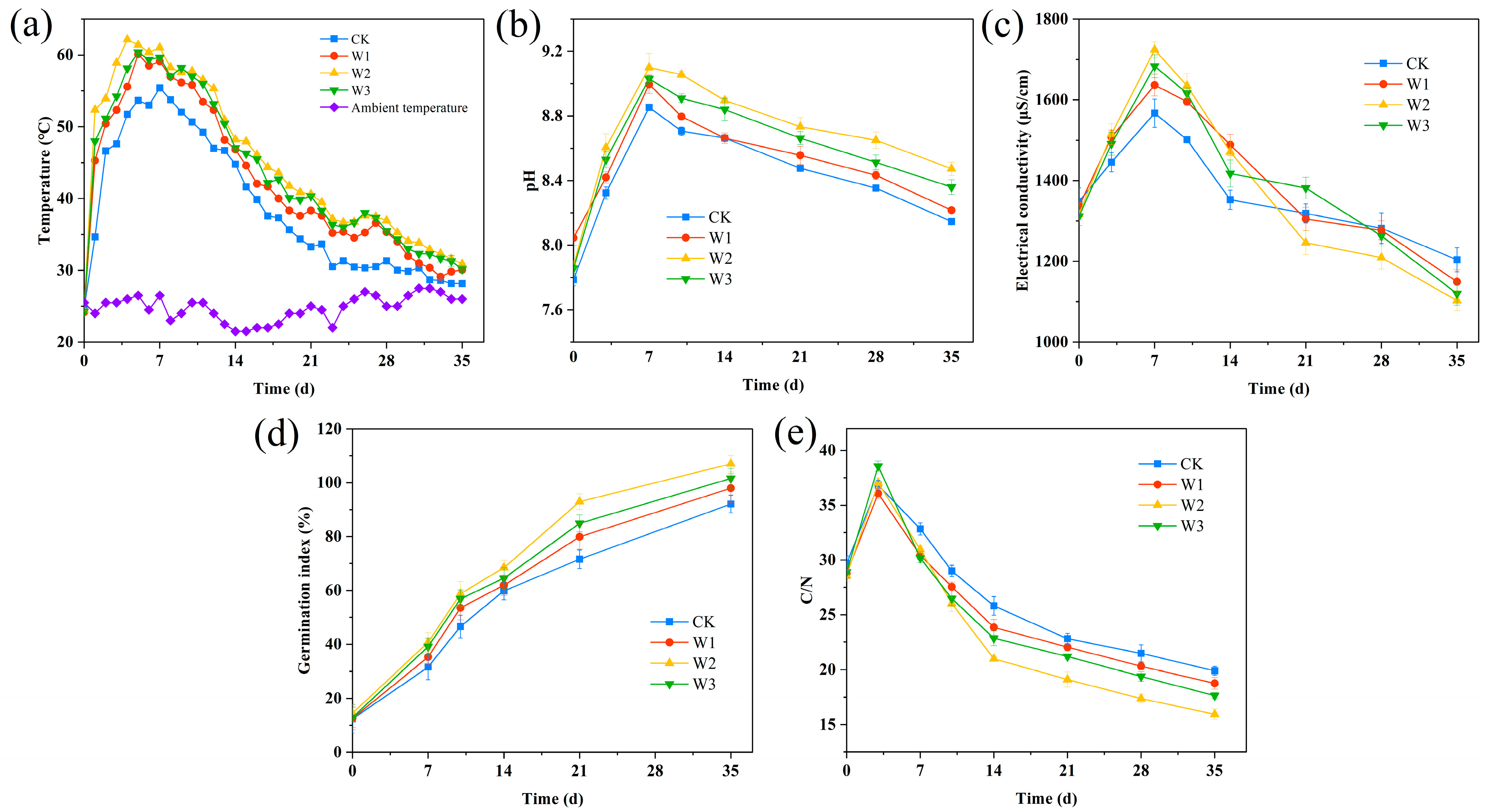 3.1. The Variation in Temperature, pH, EC, C/N Ratio, and Germination Index of Composting