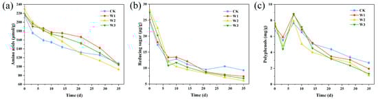 | Treatment | pH | MC (%) | TOC (%) | TN (%) | C/N | EC (mS/cm) | AA (μmol/g) | RS (μg/g) | PP (mg/g) | HA (g/kg) | FA (g/kg) | HS (g/kg) |