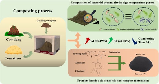 - Wang, X.; Tian, L.; Li, Y.; Zhong, C.; Tian, C. Effects of exogenous cellulose-degrading bacteria on humus formation and bacterial community stability during composting. Bioresour. Technol. 2022, 359, 127458. [Google Scholar] [CrossRef] [PubMed]