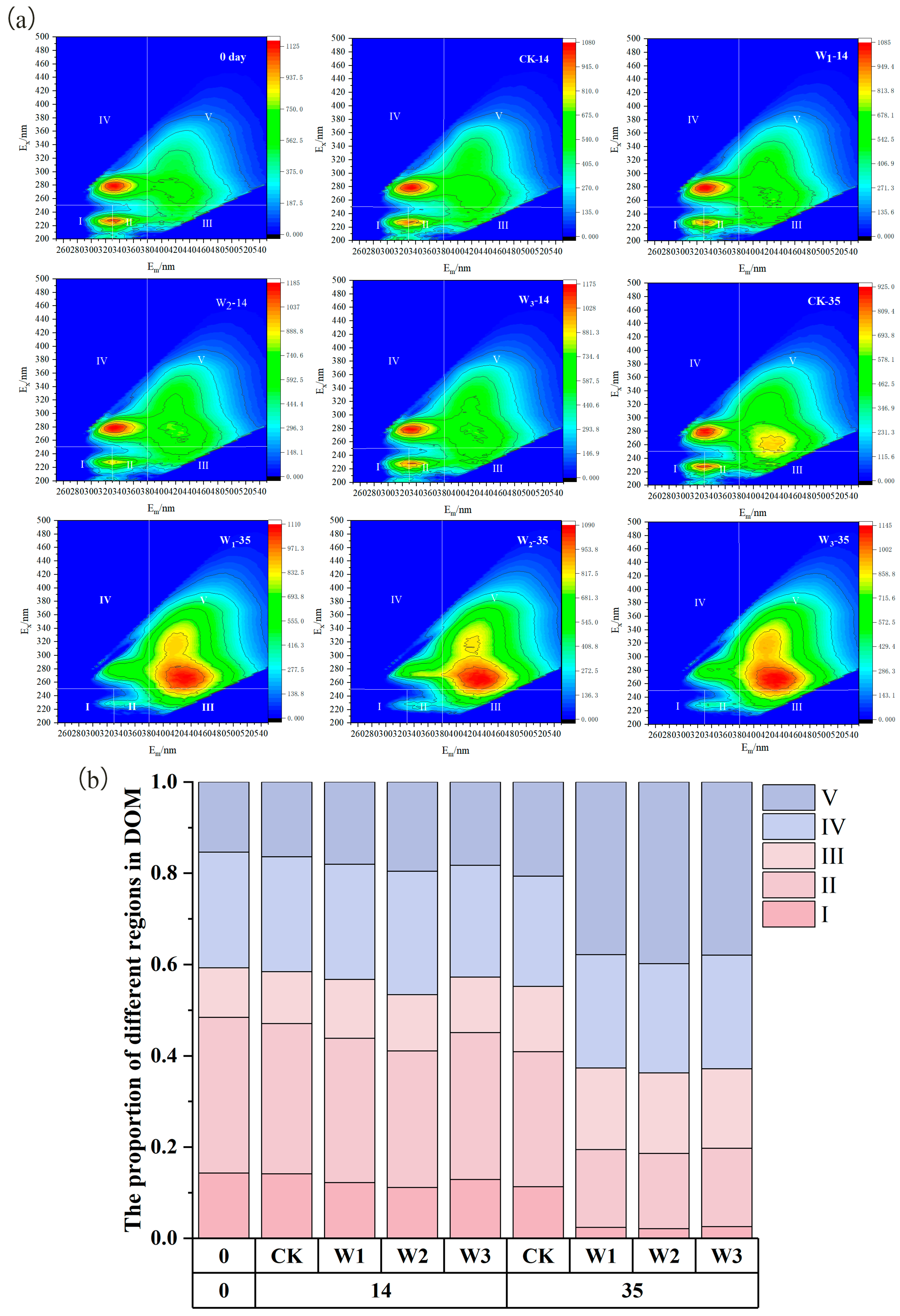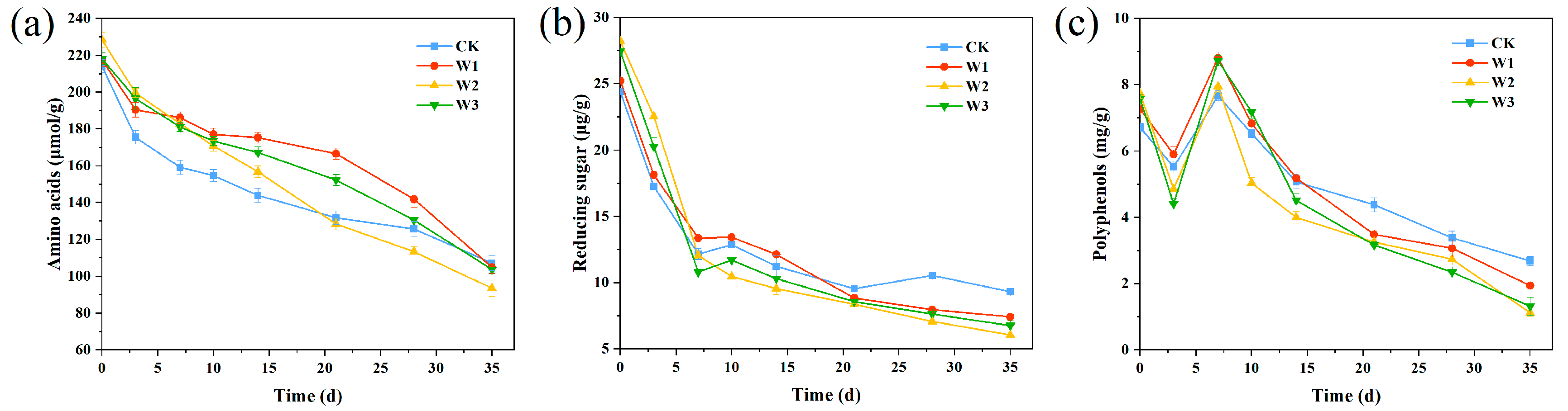 3.2. Humification Precursor Substances and EEM Analysis of the Humification Process