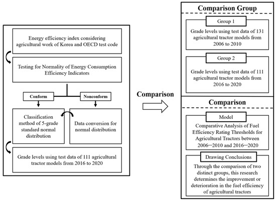 This study aims to evaluate the energy efficiency of agricultural tractors—an essential factor in sustainable farming practices and to monitor the rate of energy efficiency enhancement. Figure 1 below presents an overview of the entire analytical procedure used in this study. Firstly, energy efficiency index values, considered the characteristics of agricultural works in Korea, were evaluated based on the data in compliance with OECD test code from 111 agricultural tractor models between 2016 and 2020. Secondly, the normality tests such as the Shapiro–Wilk, Anderson–Darling, and Lilliefors tests were conducted on the dataset to establish the normal distribution.