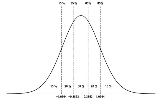 Figure 4 illustrates a normal distribution curve used to define the classification ranges of the energy efficiency index. The Z-scores of −1.0364, −0.3853, 0.3853, and 1.0364 divide the curve into five regions, each corresponding to a specific grade. Approximately 15% of the data falls below −1.0364 and above 1.0364 (1st and 5th grades), while 20% lies between each pair of adjacent Z-scores, and 30% lies near the mean (between −0.3853 and 0.3853), representing the 3rd grade.