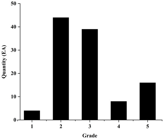 In this study, we conducted a grading process based on the energy classification of tractor models, which allowed us to observe the distribution of tractor models across different grades as depicted in Figure 6. In addition, the grade distribution by year is shown in Figure 7. Specifically, the number of tractor models classified according to their energy efficiency indicators was 4 for Grade 1, 44 for Grade 2, 39 for Grade 3, 8 for Grade 4, and 16 for Grade 5. This distribution was determined to be non-normal, suggesting an imbalance in the number of models across grades. The fact that the data distribution did not exhibit normality implies a failure to meet the prerequisite conditions for securing accuracy in statistical analysis.