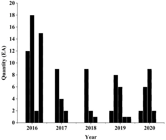 Consequently, the study leveraged test reports on tractor models provided by the Korea Agricultural Technology Promotion Agency as the primary data source. These data furnish extensive details on the performance and fuel efficiency of tractors, thereby offering significant foundational material for the research. As depicted in Figure 2, the yearly distribution of analyzed tractor models consists of 47 units in 2016, 15 units in 2017, 12 units in 2018, 18 units in 2019, and finally, 19 units in 2020. Furthermore, the distribution of agricultural tractors by horsepower per year is meticulously detailed in Table 1.