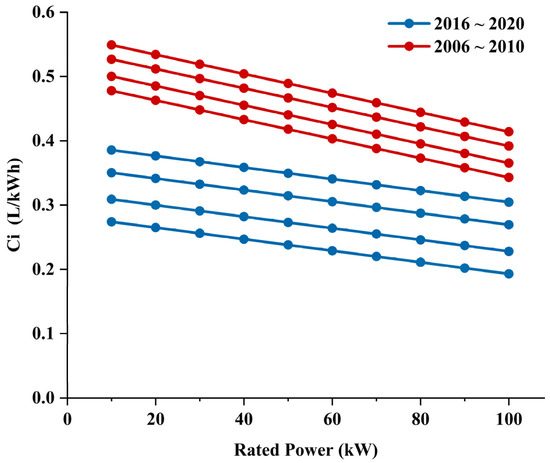 As shown in Figure 10, the fuel consumption index (Ci, L/kW·h) of tractors in Group 2 (2016–2020) consistently exhibited lower values than those of Group 1 (2006–2010) across all rated power categories. This indicates that tractors manufactured between 2016 and 2020 achieved higher fuel efficiency compared to those produced between 2006 and 2010.