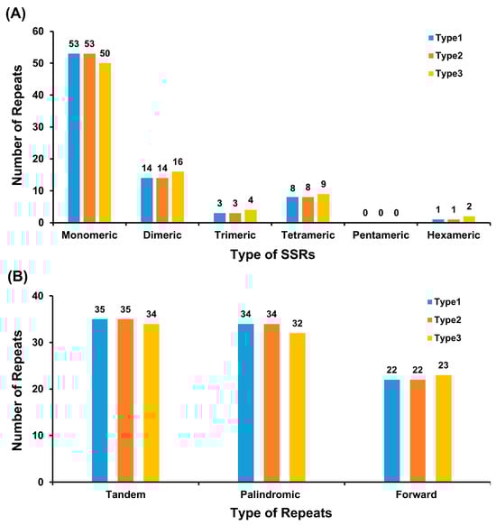 Monomeric SSRs are the most abundant, and pentameric SSRs were absent. Simple Sequence Repeats (SSRs) were abundant, with 79 SSRs in Type 1/2 and 81 in Type 3 genomes (Table S4). Mononucleotide repeats predominated, primarily thymine (T)-homopolymers (Type 1/2: 27 T-repeats; Type 3: 25 A- and 25 T-repeats). Dinucleotide repeats constituted 17.7% (Type 1/2) and 19.8% (Type 3), while pentanucleotides were absent (Figure 3A, Table S5). Tandem repeats (10–32 bp) numbered 35 in Type 1/2 and 34 in Type 3, with sequence similarity >71%. Repeat analysis was performed using MISA for SSRs(https://webblast.ipk-gatersleben.de/misa/, accessed on 7 October 2025) and Tandem Repeats Finder for tandem repeats(https://tandem.bu.edu/trf/trf.html, accessed on 7 October 2024), with minimum repeat units set to 10 for mononucleotides and default parameter for other types.