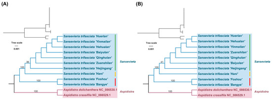 Maximum-likelihood trees based on whole-chloroplast genomes and shared coding sequences (CDS) of the 10 Sansevieria cultivars. (A) Tree constructed using whole chloroplast genomes. (B) Tree constructed using shared CDS. The trees were built with the maximum-likelihood method, and bootstrap values are shown at the nodes. Two Aspidistra species (A. crassifila and A. dolichanthera) were used as outgroups. Cultivars are labeled according to their genome type by green, yellow and red vertical bars, respectively (Type 1, Type 2, Type 3).