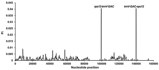 Sliding window analysis (500 bp window, 100 bp step) identified only two hypervariable regions (Pi > 0.02): rps12-trnV-GAC (Pi = 0.024) and trnV-GAC-rps12 (Pi = 0.021), both located within IR regions (Figure 6, Table S7). The majority of the genome exhibited minimal polymorphism (Pi < 0.005), highlighting exceptional sequence conservation.