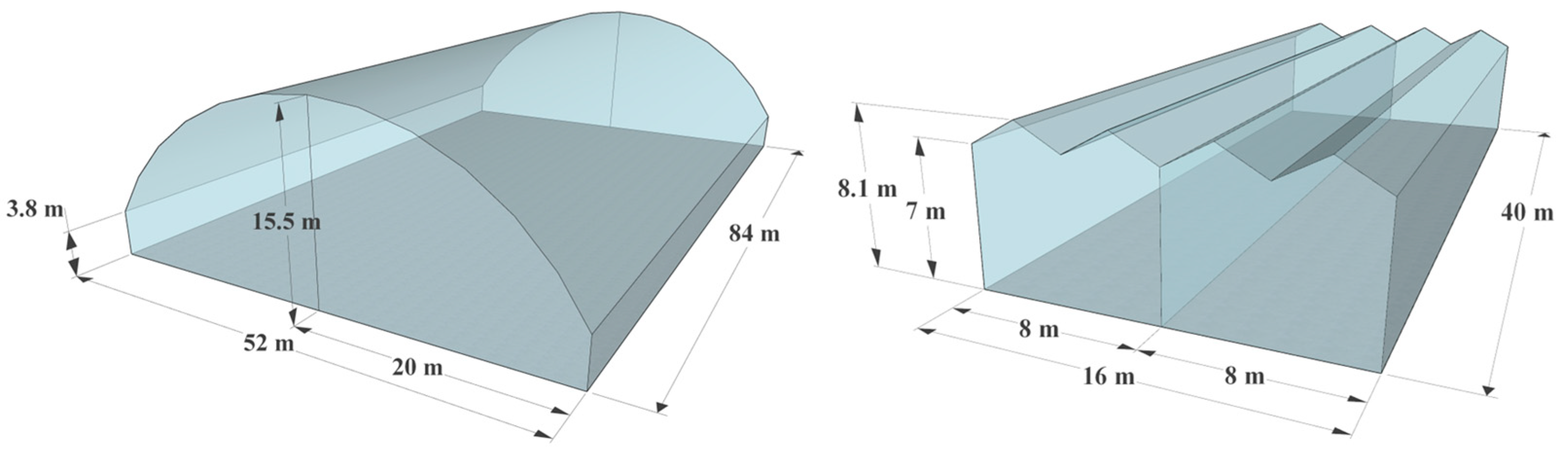 The structural configurations and dimensions of the high-height wide-type and Venlo-type greenhouses are shown in