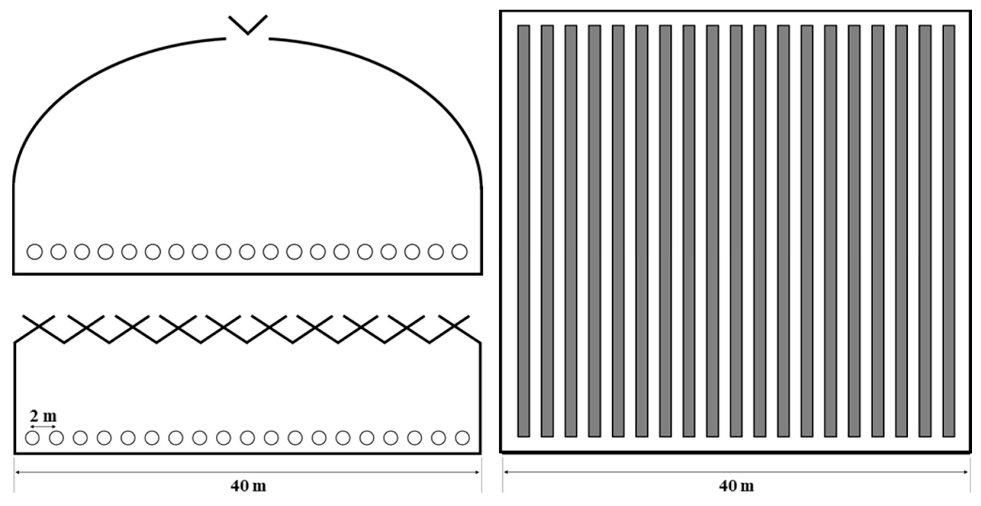In contrast, the Venlo-type greenhouse is a single-span structure with a ridge height of 8.1 m, a sidewall height of 7.0 m, a width of 8.0 m, and a length of 40.0 m. Originating in Europe—particularly the Netherlands—this type of greenhouse is characterized by its sawtooth-shaped roof design, rather than an arched form, enabling continuous roof vents. The high sidewalls and multiple ventilation openings distributed along the roof facilitate the effective discharge of accumulated heat from the upper zone, enhancing the natural ventilation performance.