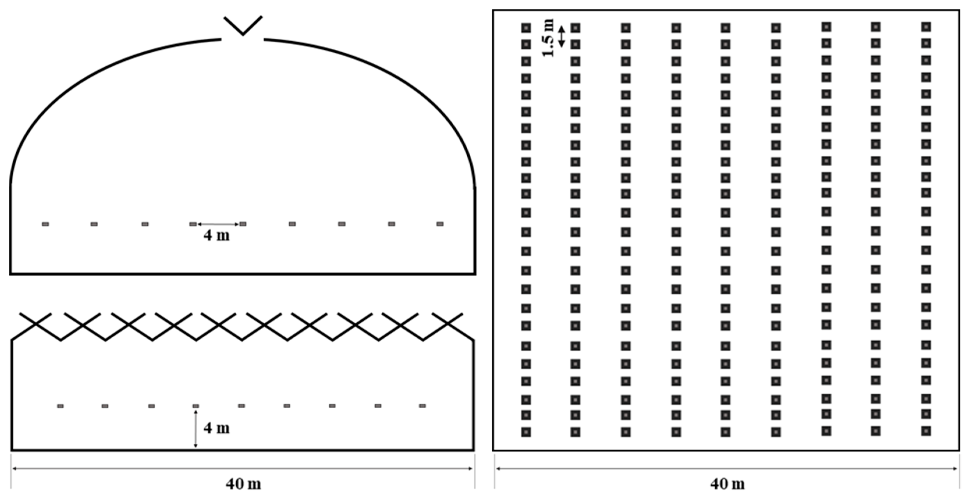 Schematic layout of the fog system configuration for the high-height wide-type greenhouse and the Venlo-type greenhouse (pipe spacing: 4 m; nozzle spacing: 1.5 m).
