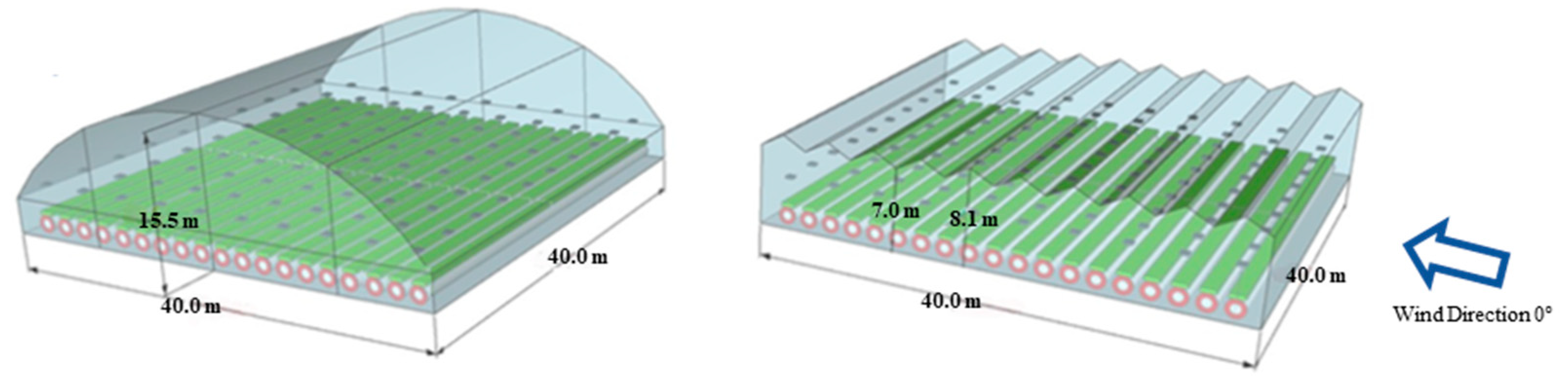 - Wei, X.; Li, B.; Lu, H.; Guo, J.; Dong, Z.; Yang, F.; Lü, E.; Liu, Y. Optimization of Greenhouse Structure Parameters Based on CFD Simulation. Agriculture 2025, 15, 1660. [Google Scholar] [CrossRef]