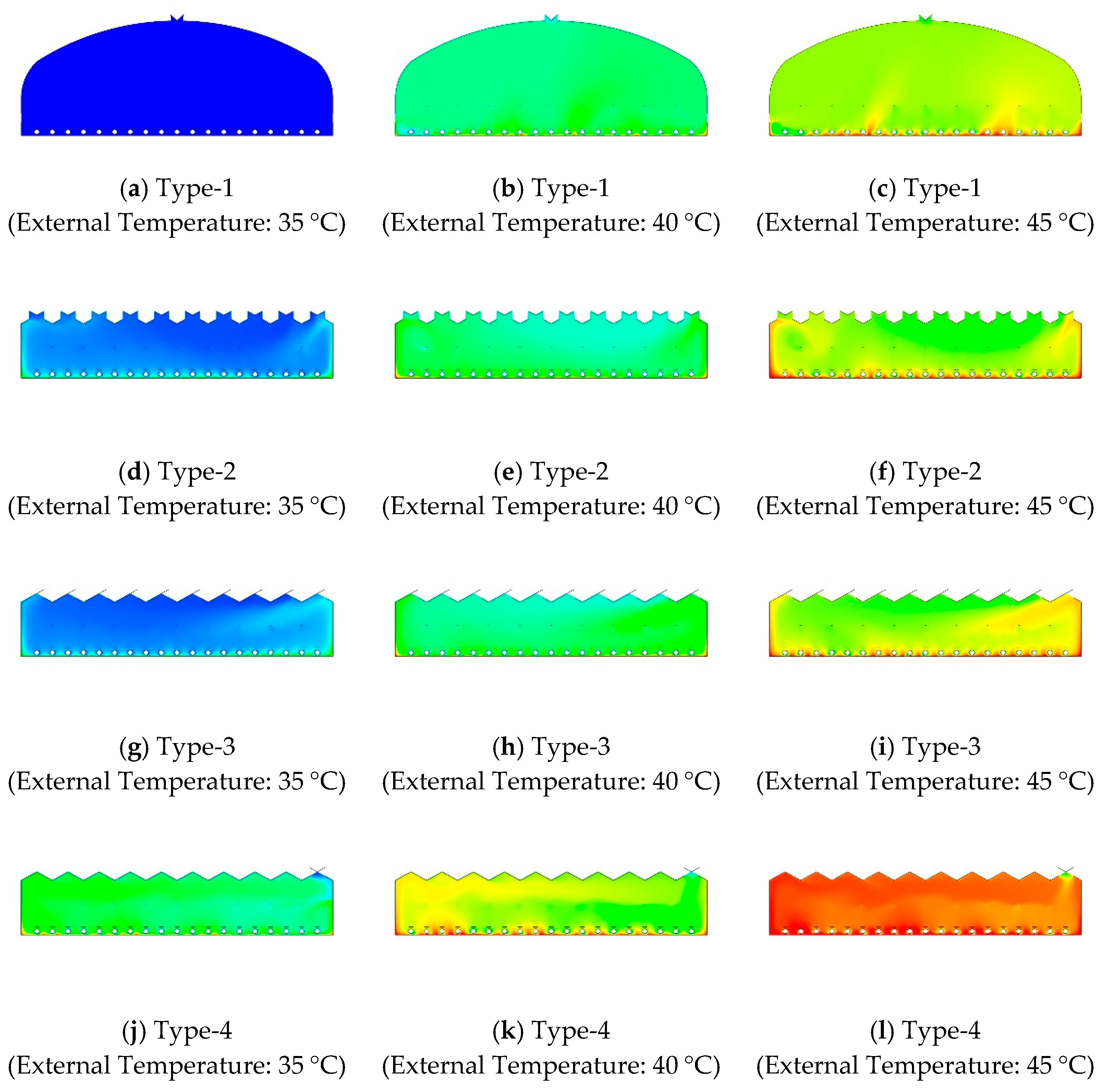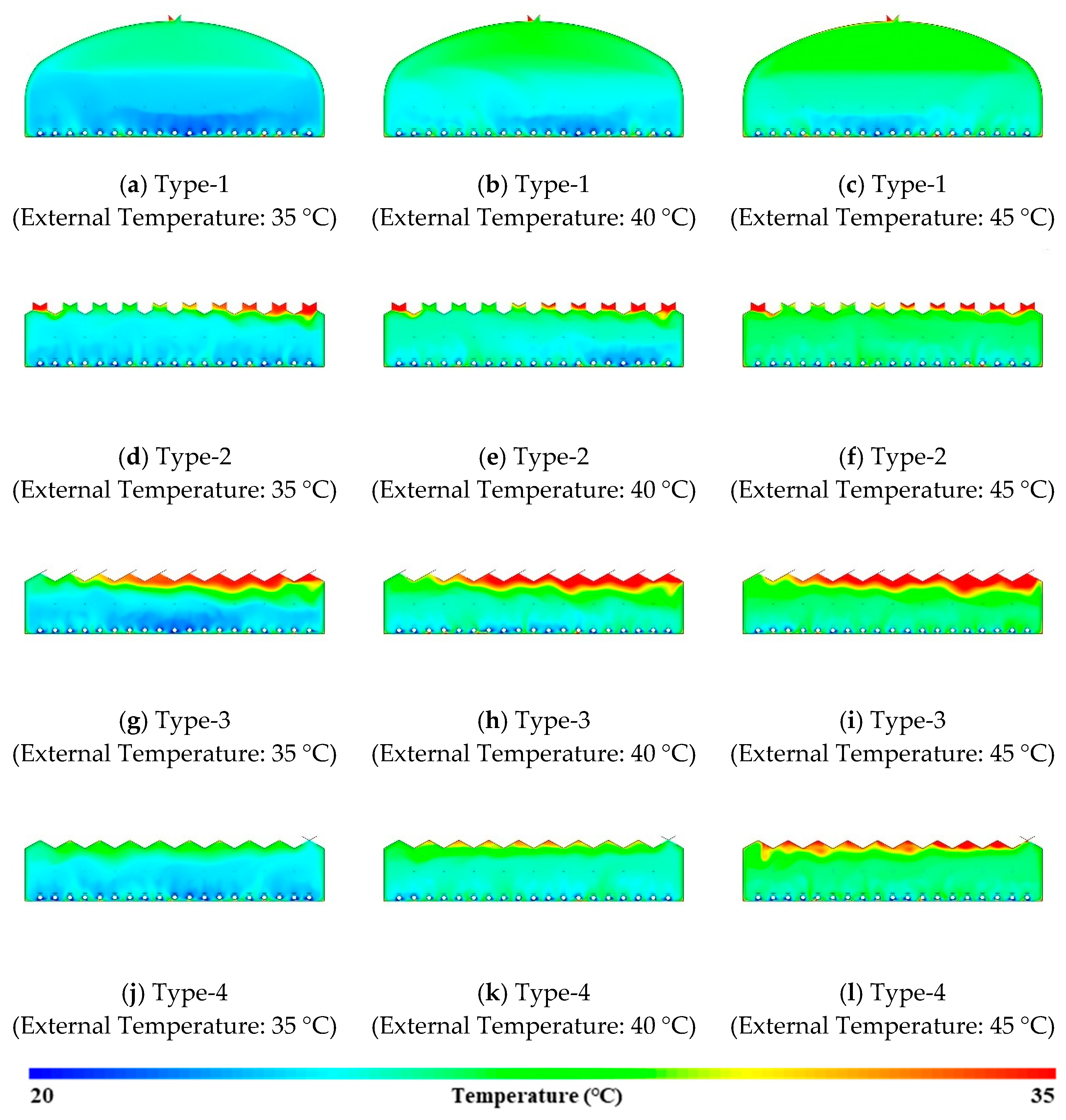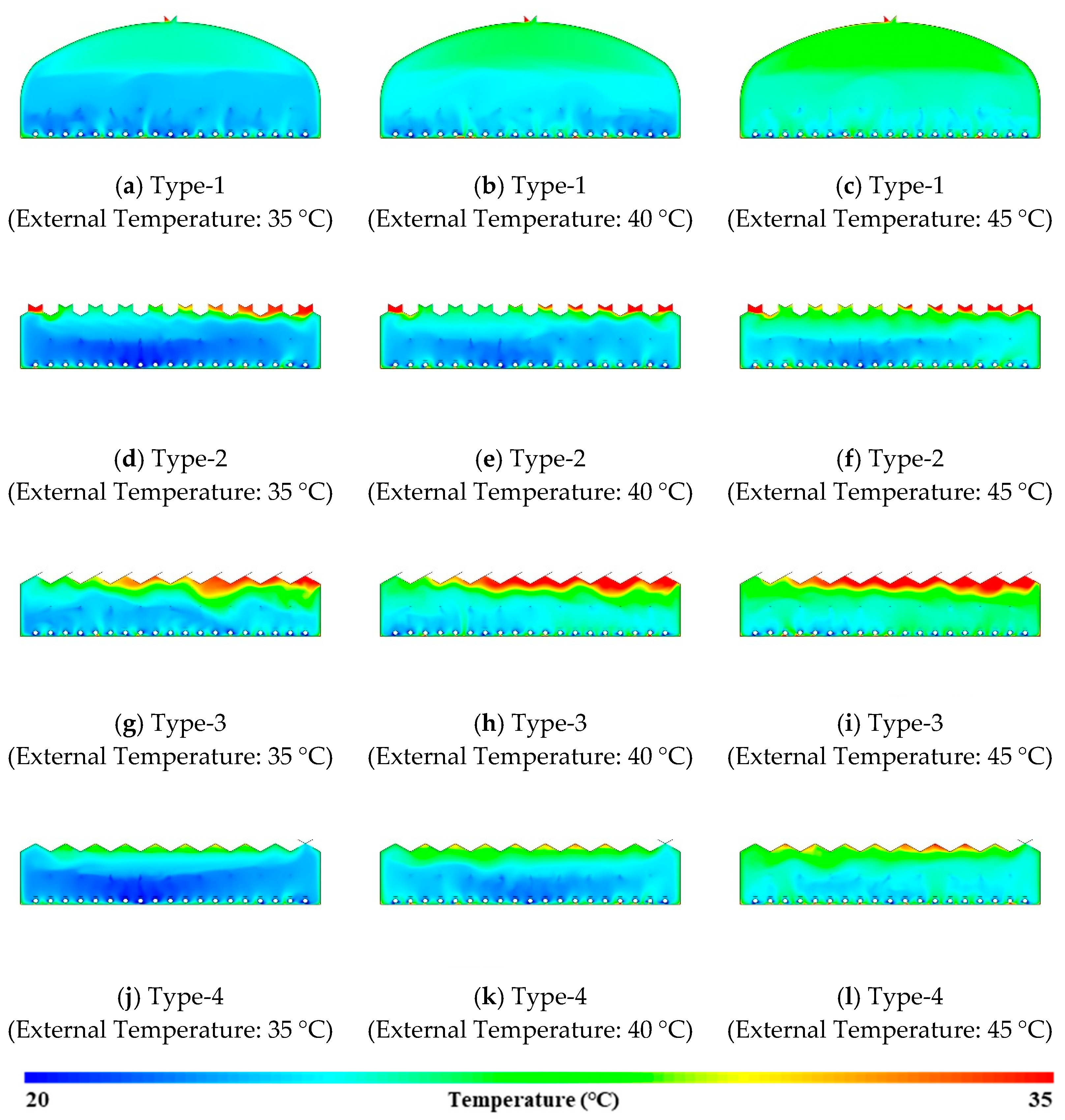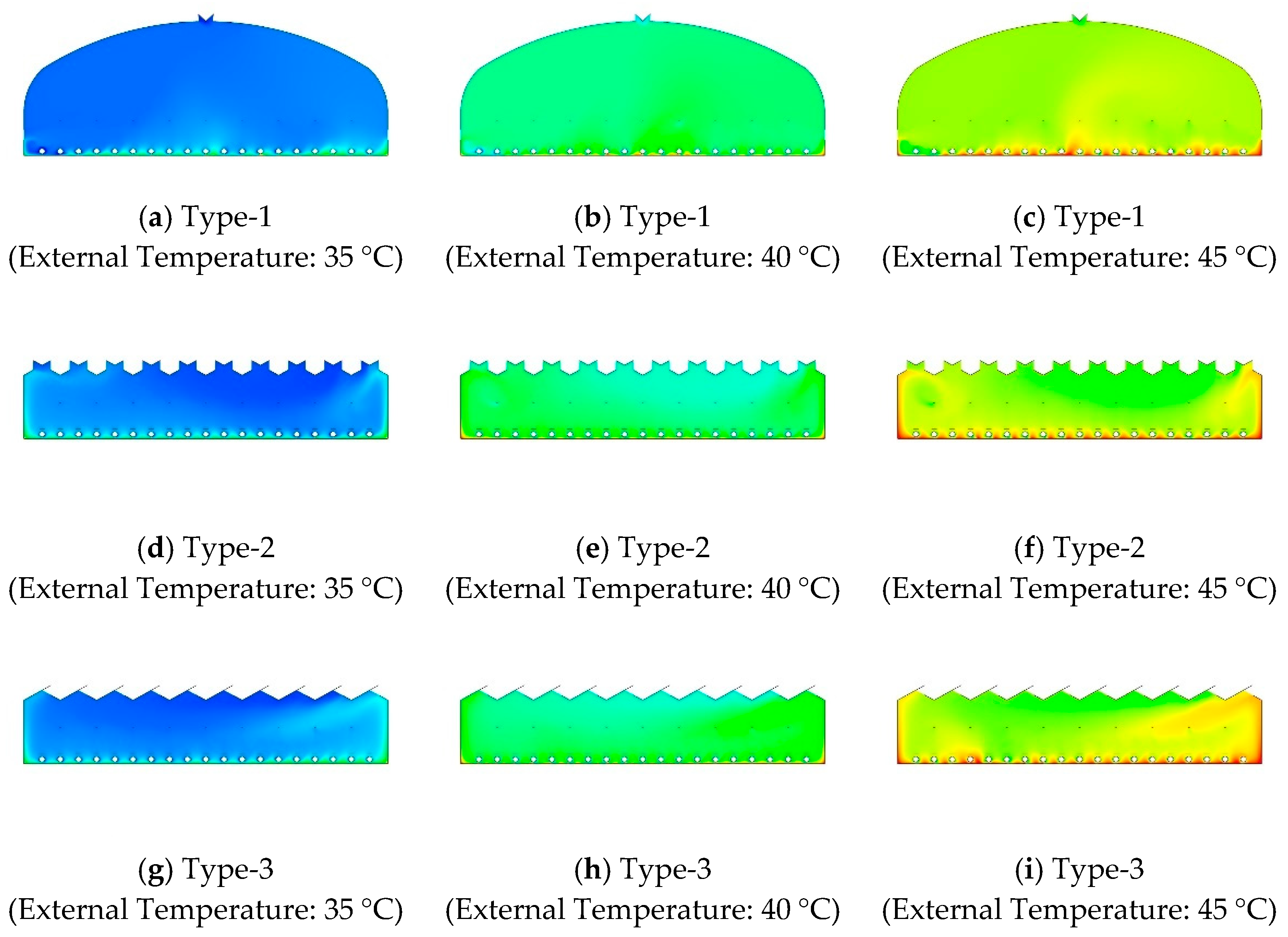 External air temperatures were set to 35, 40, and 45 °C to represent extreme summer conditions typical in South Korea. A reference wind speed of 2.0 m·s