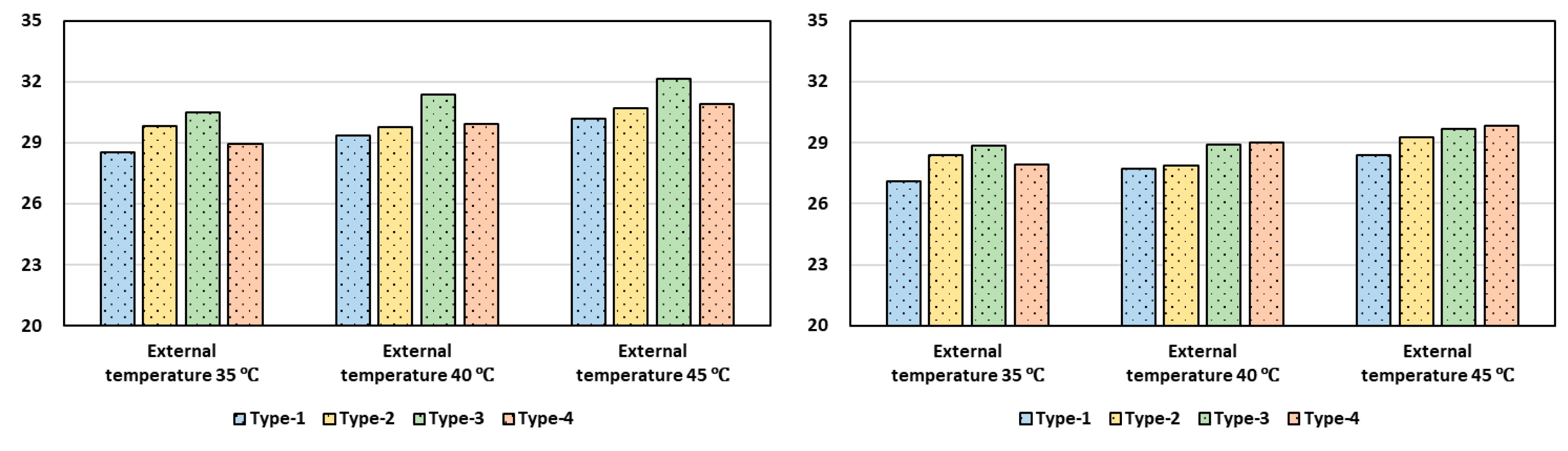 | 35, 40, 45 °C | 4 (Type-1, 2, 3, 4) | Fogging system | Spray volume (L·min−1) | 27, 35 | 24 |