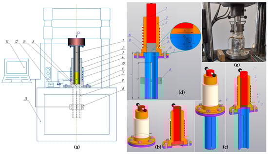 General view and schematic diagram of the device used for studying the densification process of plant biomass into briquettes: (a) general scheme; (b) briquetting process in a closed cavity; (c,d) briquetting process in continuous flow; (e) real view photo. 1—piston; 2—upper chamber; 3—die; 4—heating element; 5—thermocouple; 6—fastening screws for attaching the device to the hydraulic press; 7—support plate; 8—limiting ring with strain gauge for pressure measurement; 9—lower chamber; 10—biomass during compaction; 11—computer for recording and managing compaction regimes; 12—temperature monitoring unit; 13—hydraulic press; 14—removable plug.