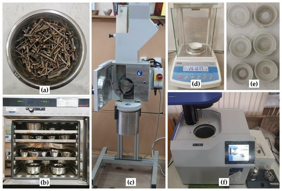 Equipment used for biomass testing: (a) biomass samples before shredding; (b) Memmert UNB 500 thermostatic chamber (Memmert GmbH, Schwabach, Germany); (c) Retsch SM 100 hammer mill (Retsch GmbH, Haan, Germany); (d) RADWAG AS 220/C/2 analytical balance (Redwag, Radom, Poland); (e) milled samples for calorific value determination; (f) IKA C6000 isoperibolic calorimeter (IKA, Staufen, Germany).