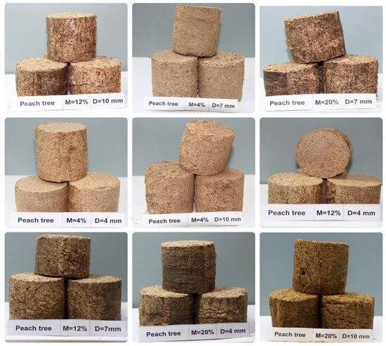 Therefore, the aim of this study is to improve the production process of densified solid biofuels derived from orchard biomass. The main objectives were: to determine the potential of orchard plant biomass suitable for producing DSBF under the conditions of the Republic of Moldova; to establish the optimal condition of the biomass prior to processing by analyzing the effect of particle size and moisture content on the densification capacity of DSBF; to investigate possibilities for improving DSBF by formulating mixtures using peach pruning residues in combination with WS and SFR, which are abundant in the Republic of Moldova; and to determine the technological densification regimes.