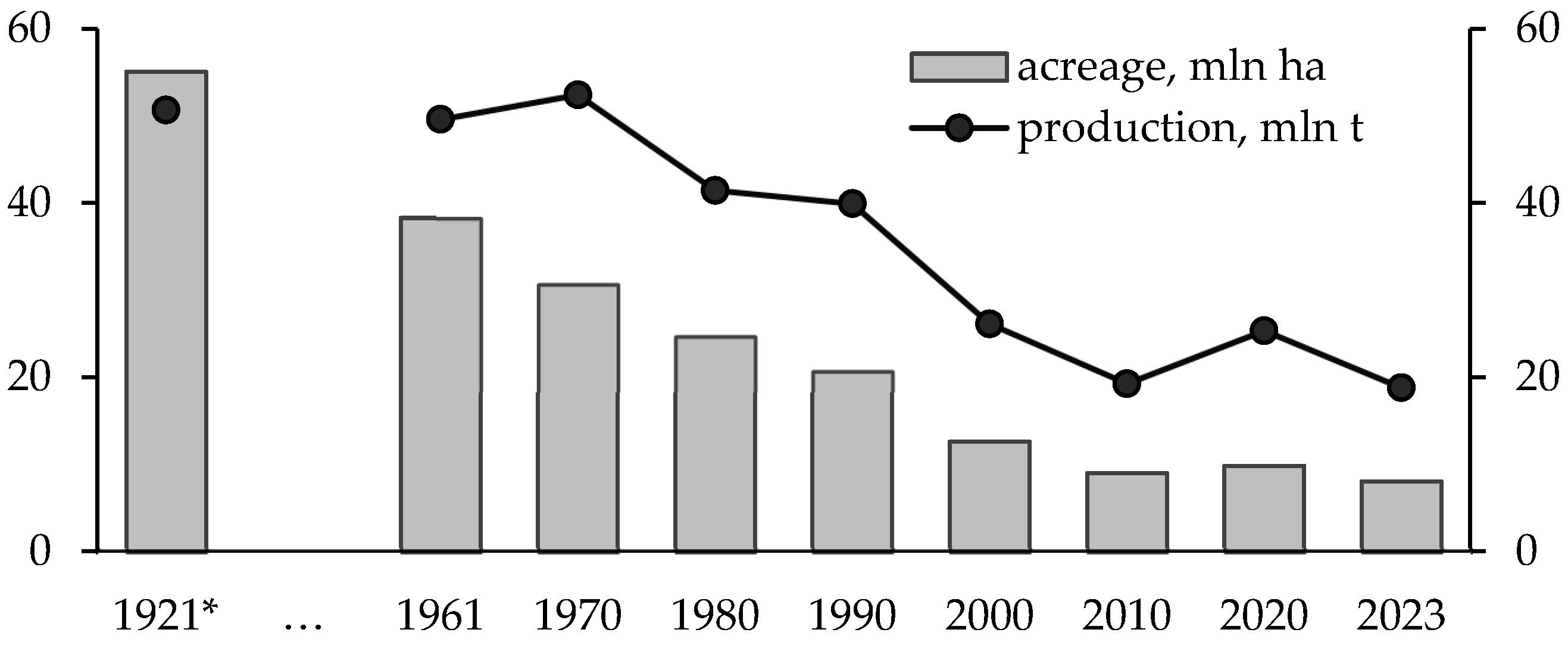 Figure 1. Global oat acreage and grain production from 1921 to 2023 (* USDA [17] for 1921, FAO [7] for other years).