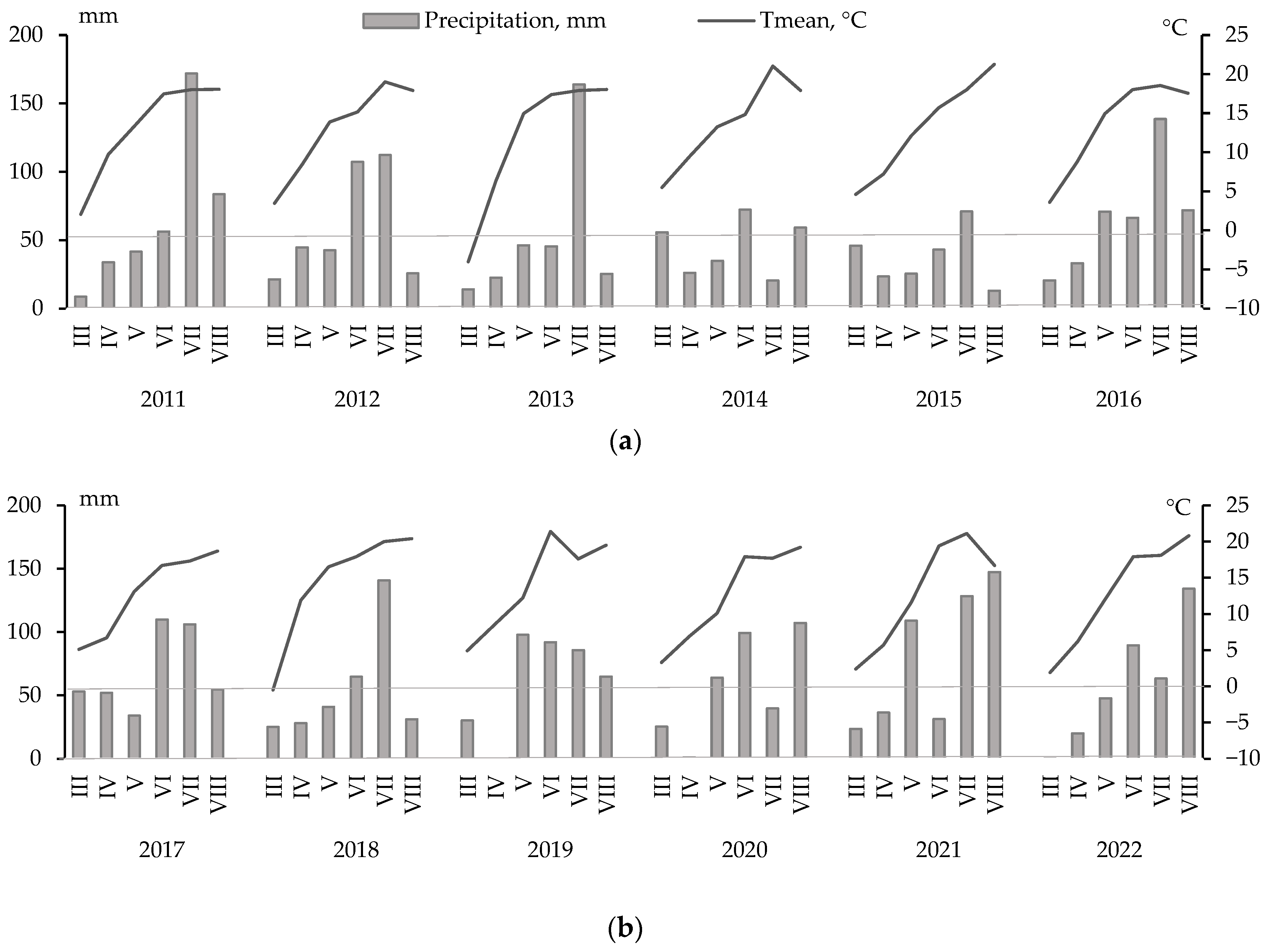 Figure 2. Atmospheric precipitation and daily air temperature during the 2011–2016 (a) and 2017–2022 (b) study periods in accordance with the Meteorological Station in Bałcyny, Poland.