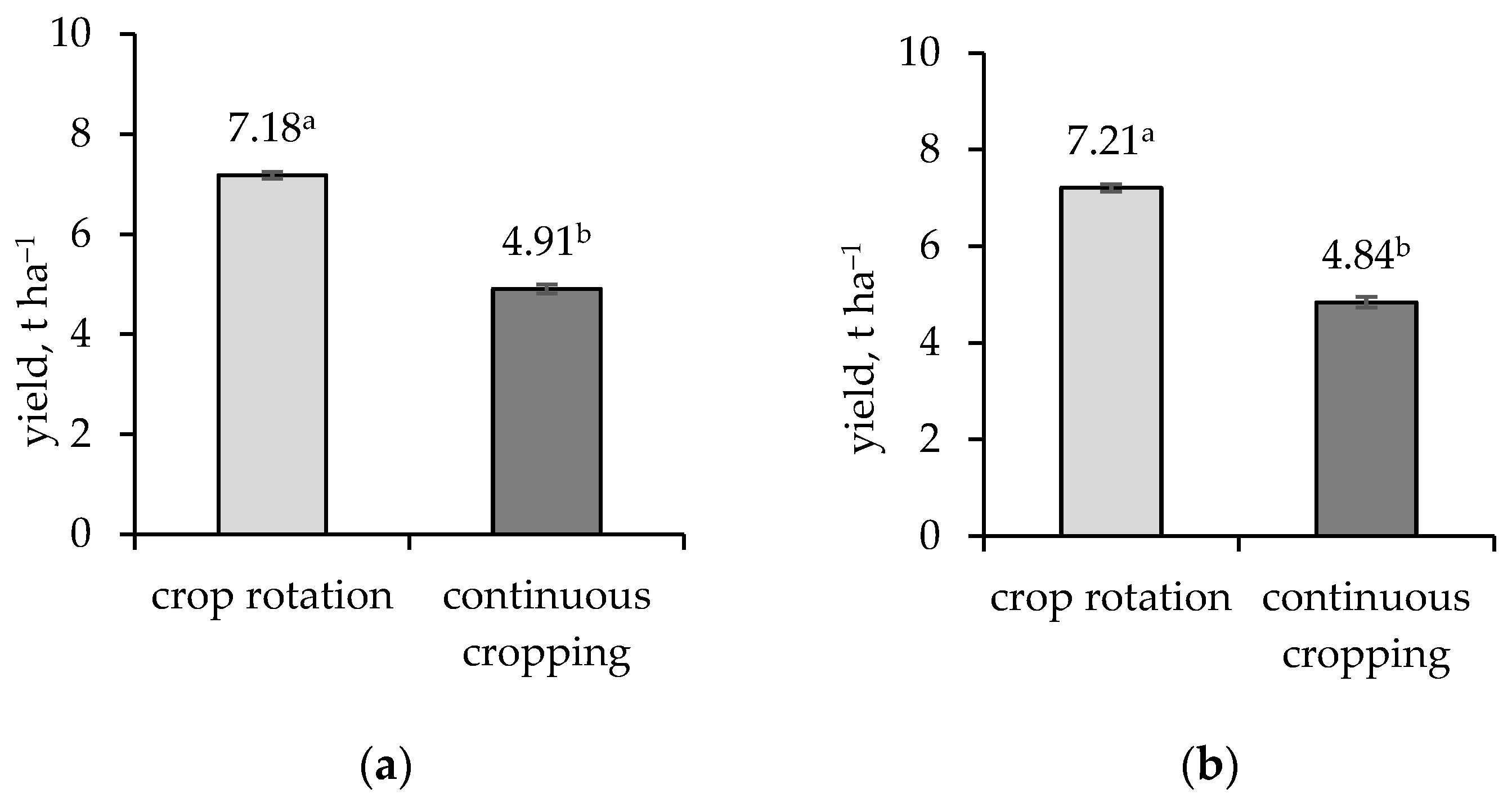 A distinctive virtue of the present study is that it is based on a long-term experiment conducted over 50 years. This type of trial reveals cumulative agroecosystem processes that short-term studies cannot capture, including gradual shifts in weed communities, changes in pathogen pressure, and long-term modifications of soil properties [22,23]. Consequently, some of the observed patterns, particularly the magnitude of continuous cropping effects and the variety-specific responses across years, may not be consistent with the outcomes reported from short-term experiments [8].