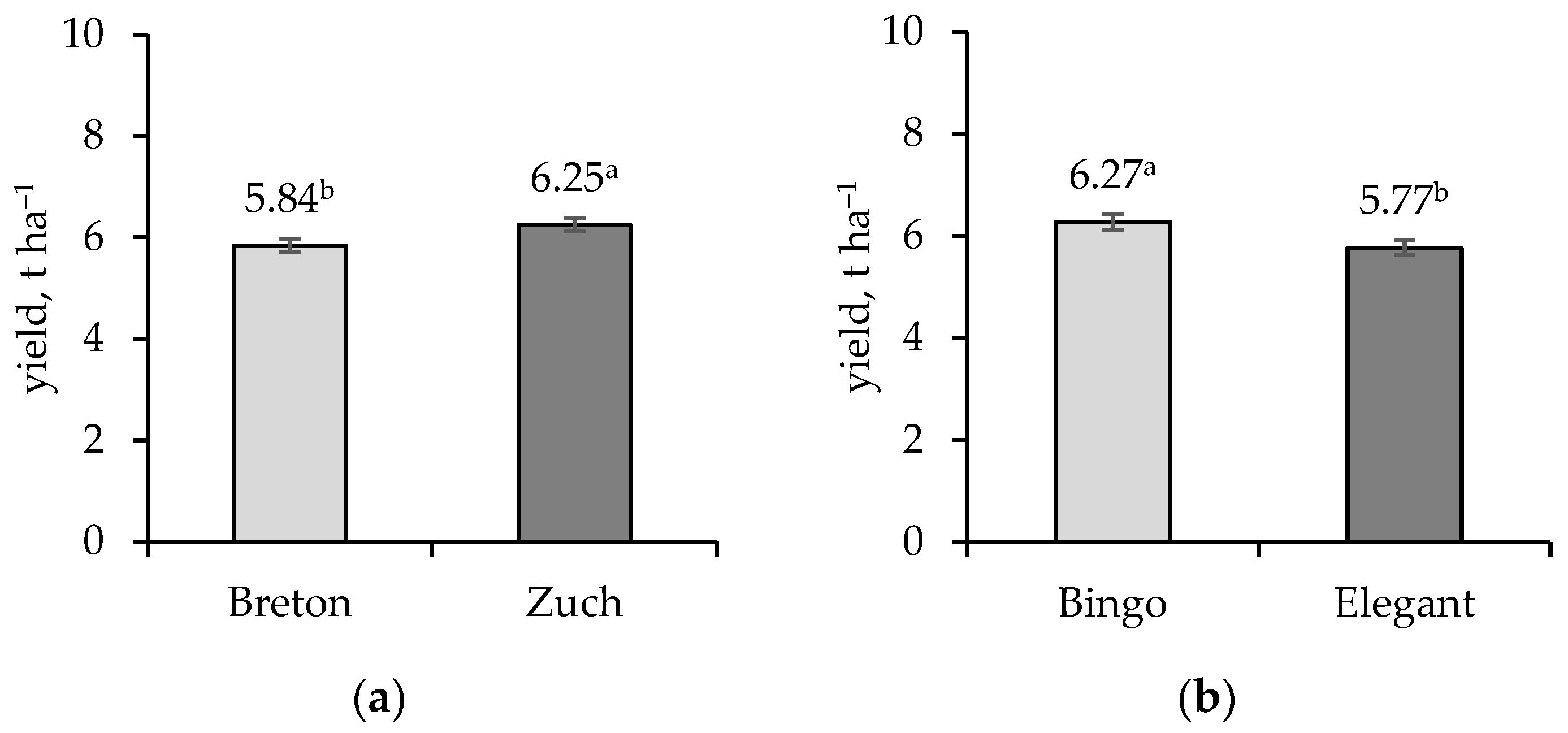 3.1. Individual Effects of the Cropping System, Variety, Crop Protection, and Year Factors