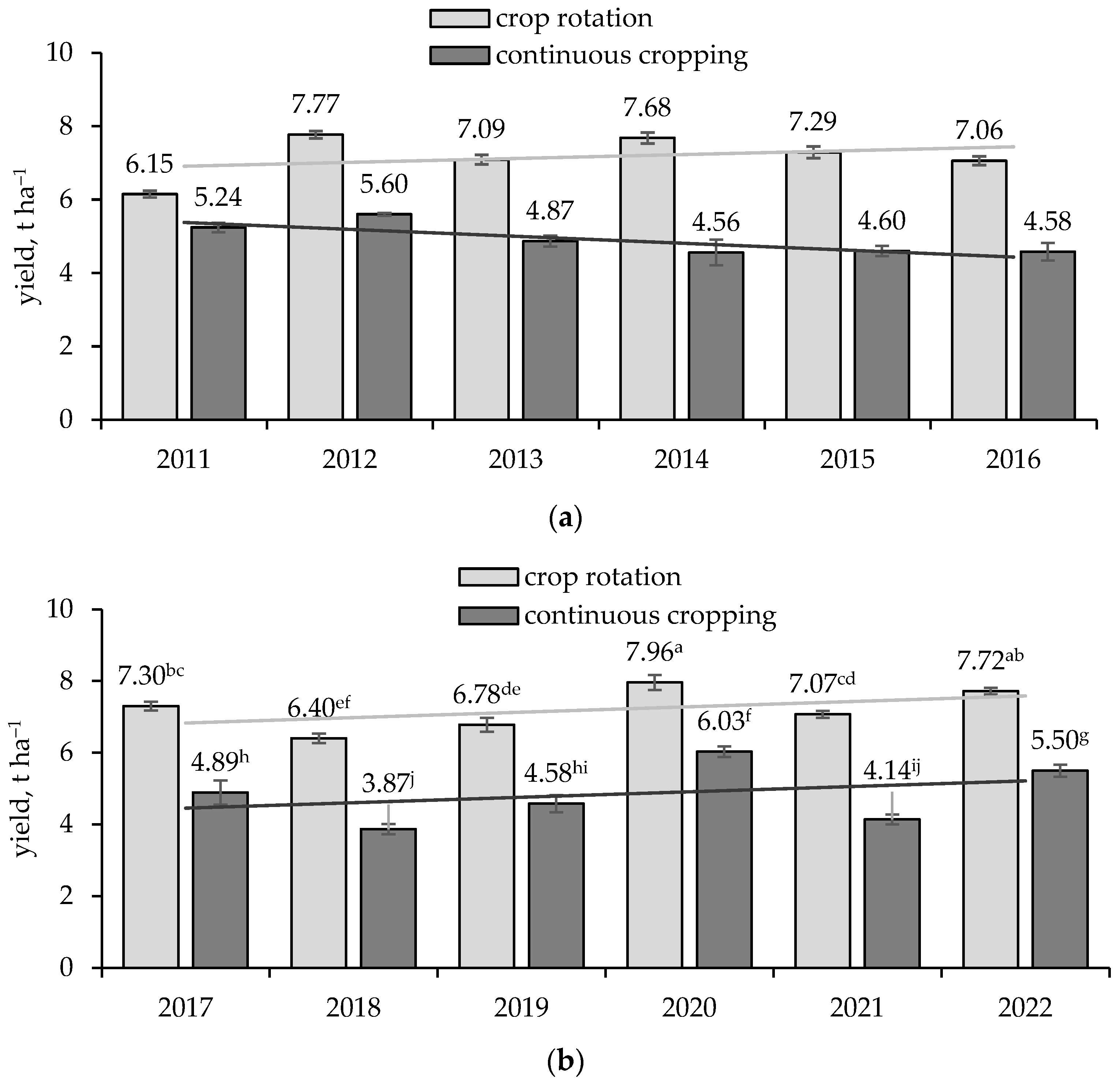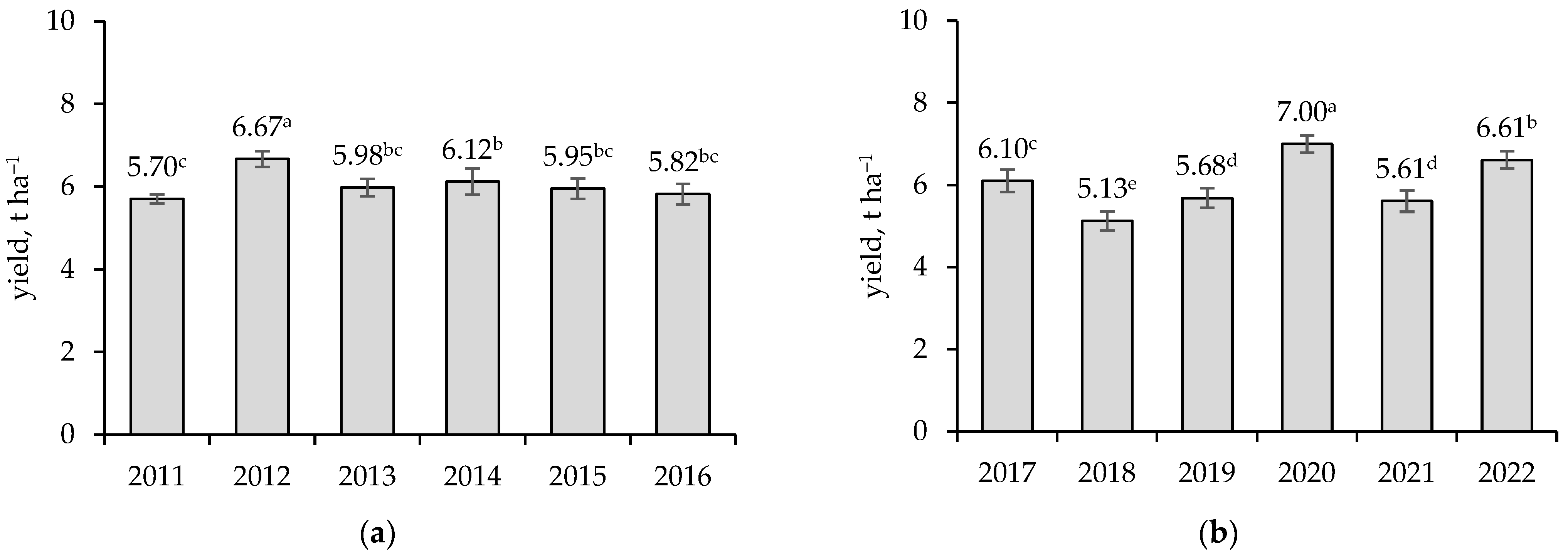 Figure 7. Effects of years (Y) on spring oat yields in the 2011–2016 (a) and 2017–2022 (b) cycles (means and standard errors). Different letters indicate significant differences at p < 0.05.