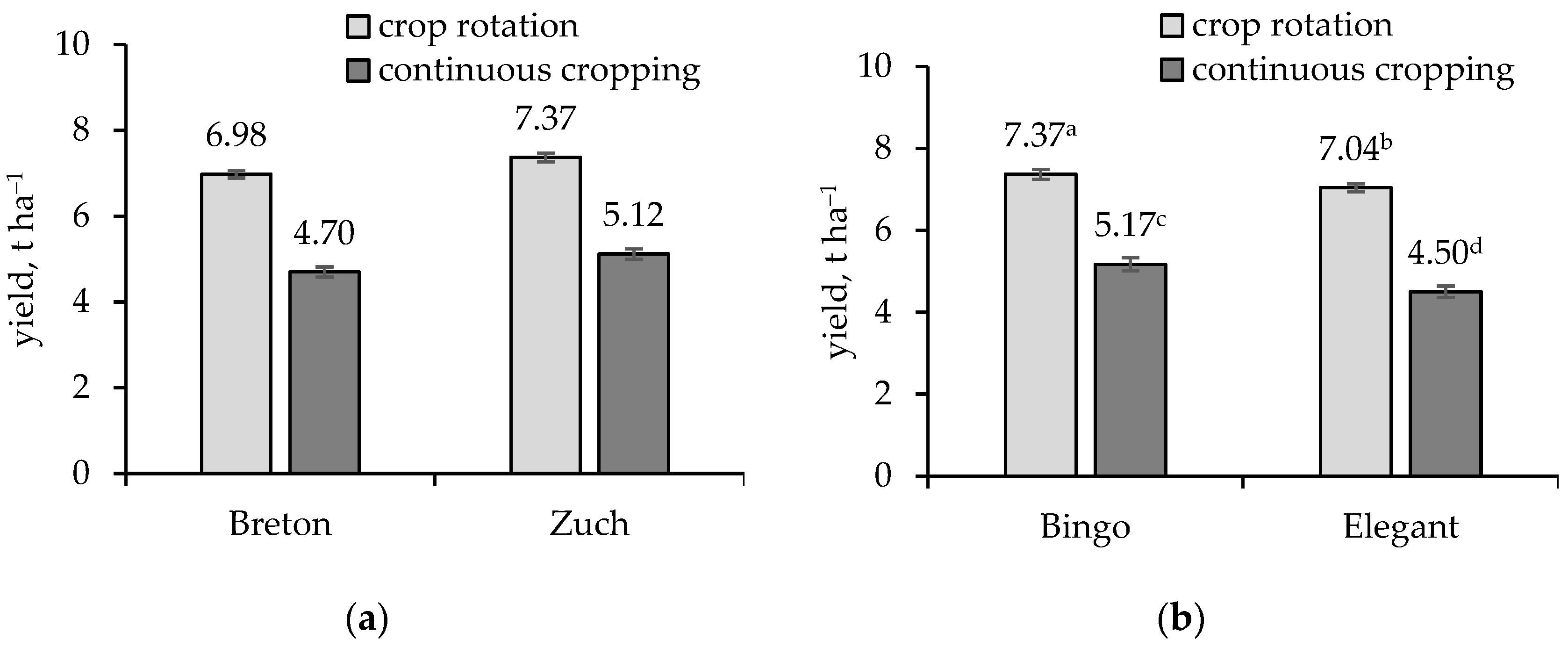 In both crop rotation cycles, oat varieties exhibited higher productivity under the CR system compared to the CC system (Figure 8). In both CR and CC systems, the Zuch variety outperformed the Breton variety, and the Bingo variety surpassed the Elegant variety. The Breton and Zuch varieties experienced the same yield decrease under CC, while the Elegant variety suffered greater yield loss than the Bingo variety.