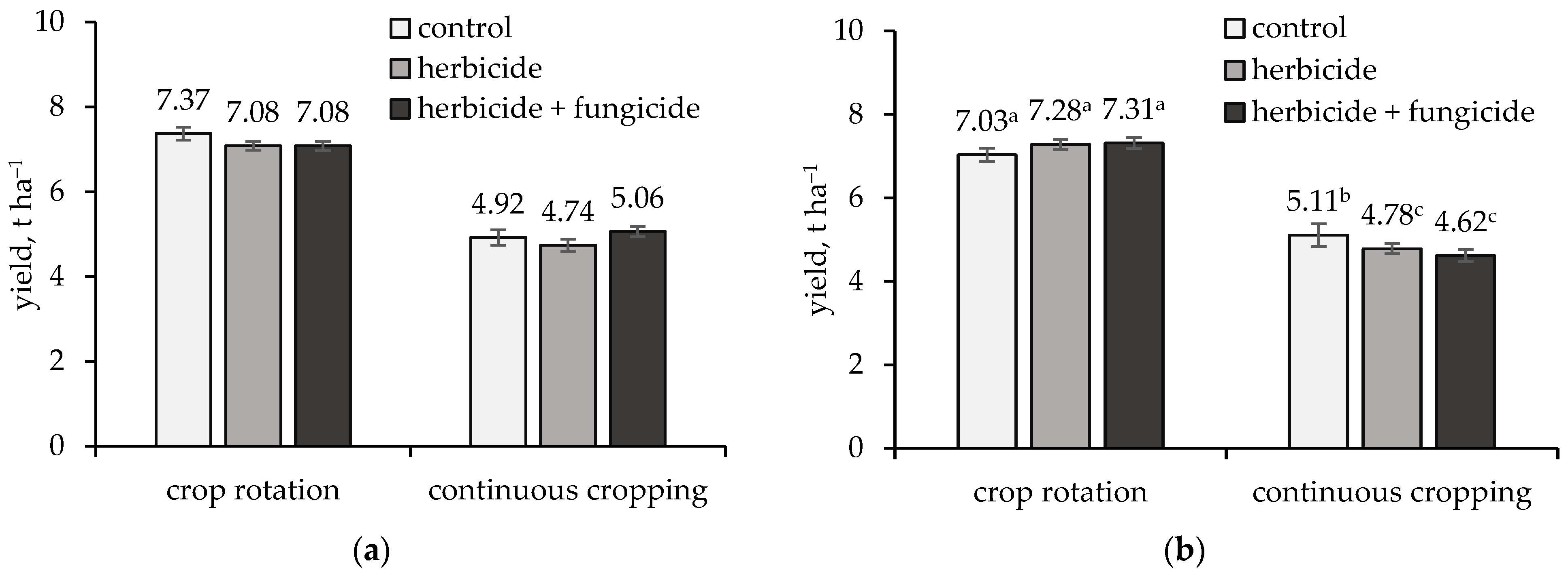 Figure 6. Effects of crop protection (CP) levels on spring oat yields in the 2011–2016 (a) and 2017–2022 (b) cycles (means and standard errors). Different letters indicate significant differences at p < 0.05; no letters—differences not significant at p < 0.05. Abbreviations used in the main text: control (C), herbicide (H), herbicide + fungicide (HF).