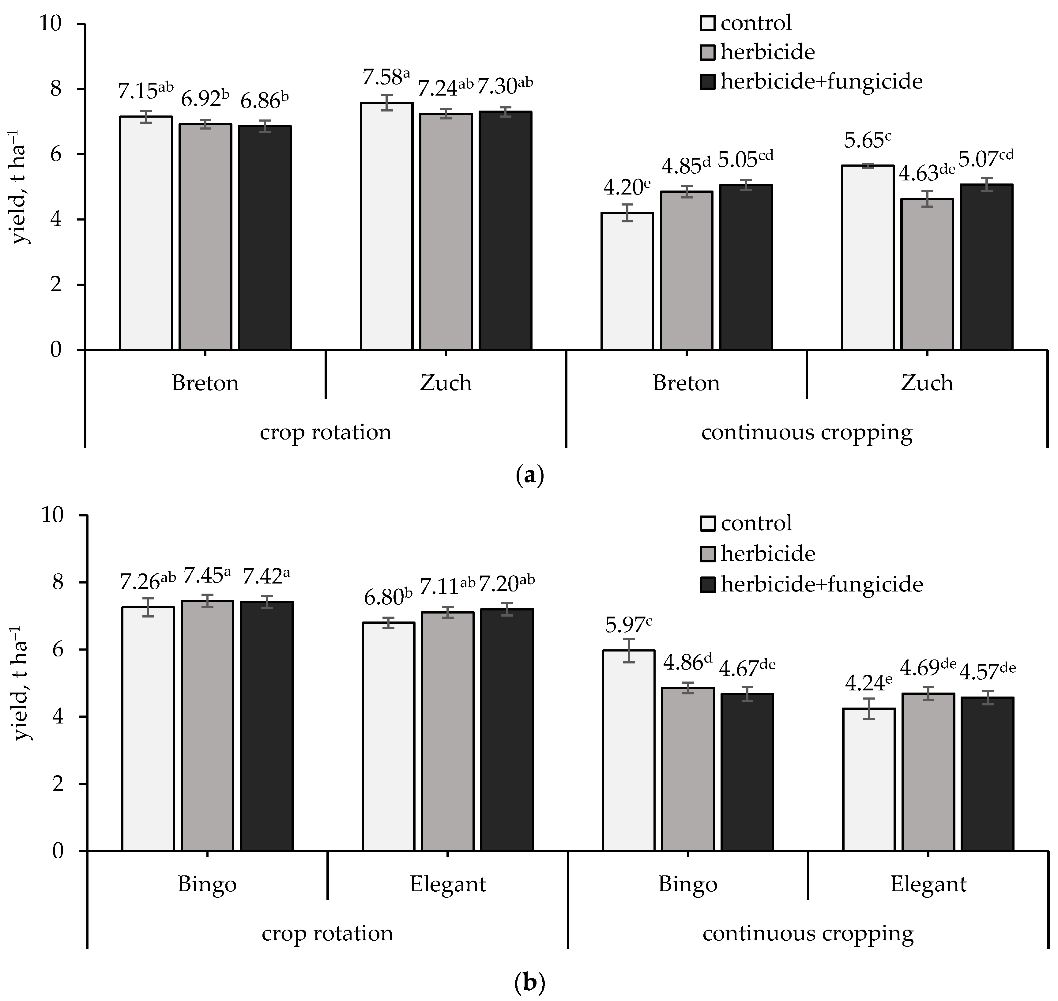 Figure 5. Effects of varieties (V) on spring oat yields in the 2011–2016 (a) and 2017–2022 (b) cycles (means and standard errors). Different letters indicate significant differences at p < 0.05.