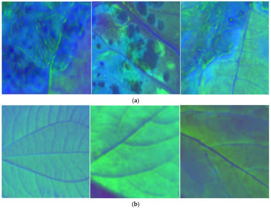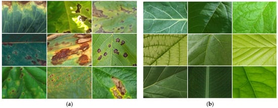 Set of images of leaves of different crops under different climatic and geographical conditions: leaves of (a) diseased and (b) healthy plants.