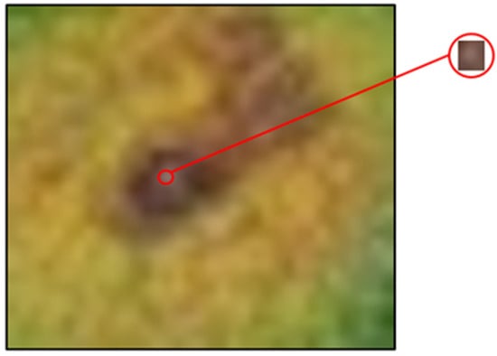 Pixel-based pattern recognition according to an associated color scale in a diseased plant.