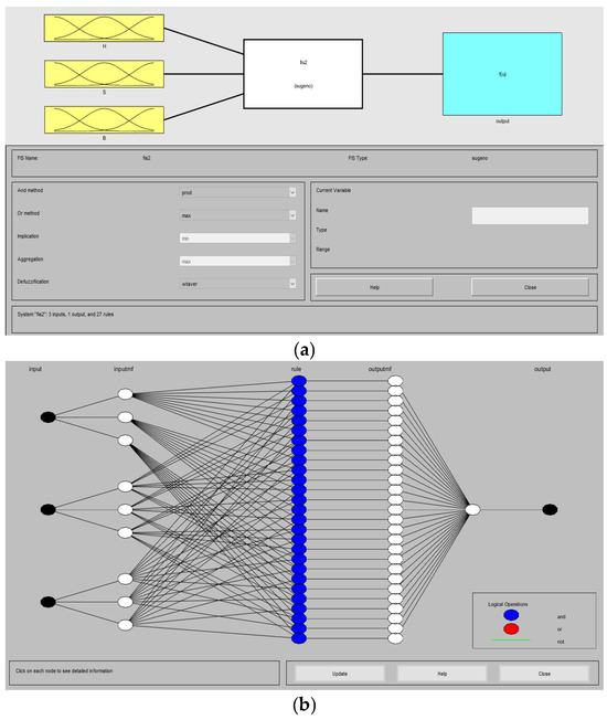 The Sugeno fuzzy system addresses classification problems through fuzzy rules with output functions that are typically linear or constant, enabling interoperability and optimal results in applications [30]. In the proposed model, an initial Sugeno system was developed to detect, at the pixel level on the HSB scale, the specific features associated with the color tone of Xanthomonas campestris disease. This output allows a second system with similar characteristics to make decisions regarding the leaf’s condition based on the overall results of an image.