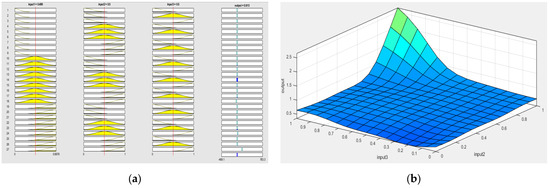 Components for the first neuro-fuzzy inference system: (a) rule set; (b) output neuro-fuzzy surface.
