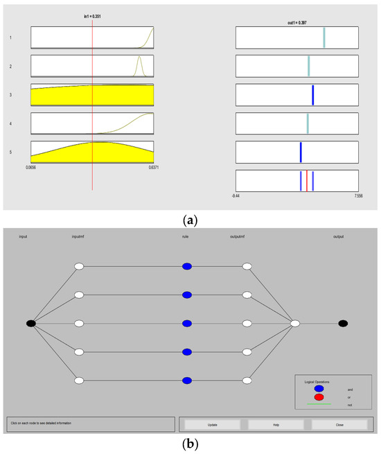 Structure of the ANFIS neuro-fuzzy network for the first system: (a) general configuration of the neuro-fuzzy sets and their membership functions; (b) architecture of the ANFIS neuro-fuzzy network for classification.