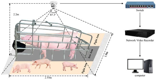 The experimental data for this study were collected in August 2022 at the Yingguang Pig Farm’s sow farrowing house in Zhenjiang City, Jiangsu Province. The sow breed used was Large White. A total of 31 sow farrowing pens were randomly selected as experimental scenes, each measuring 1.9m × 2.55m and housing one sow along with 5 to 12 piglets. A hemispherical camera (DS-2CD3325D-I, Hikvision, Hangzhou, China) was installed 2.2 m directly above the center of each farrowing pen to record the daily activities of the piglets. The camera has a horizontal field of view of 87.3°, allowing full coverage of the farrowing pen area. It was connected to a switch (DS-3E0518P-E, Hikvision, China) via an Ethernet cable and powered using Power over Ethernet (POE) technology, enabling simultaneous power supply and video data transmission. The video data were recorded at a frame rate of 25 frames per second (fps) with a resolution of 1920 × 1080 pixels and stored on a network video recorder (DS-8832N-R8, Hikvision, China) for subsequent data processing and analysis. A schematic diagram of the data collection scene is shown in Figure 1.