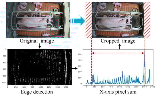 Since the acquired images have a 16:9 aspect ratio, whereas the actual sow farrowing bed area has an approximate 4:3 aspect ratio, the captured images include irrelevant scenes outside the sow farrowing bed. Due to the significant differences between the edges of the sow farrowing bed and the ground, horizontal edge detection was performed on the images. The cumulative maximum values along the horizontal positions were calculated to determine the fencing position of the sow farrowing bed. The specific image cropping process is illustrated in Figure 3, and the exact coordinate positions are defined by Equation (1).