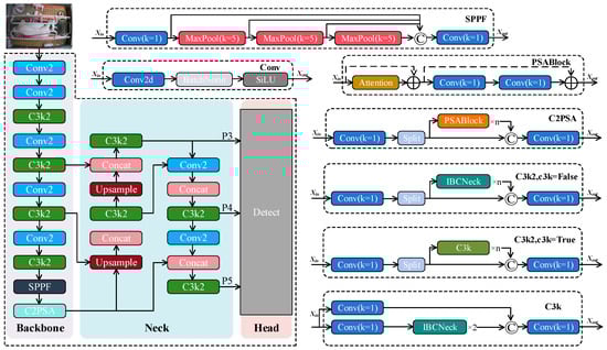YOLO (You Only Look Once) [] is a classic single-stage object detection algorithm known for its fast detection speed and high real-time performance, as it can perform object detection tasks with a single model inference. Its core architecture consists of three main components: a backbone feature extraction network (backbone), a feature fusion layer (neck), and detection heads (heads). The input image is first passed through the backbone network to extract multi-scale features, constructing a Feature Pyramid Network (FPN) []. Then, a Path Aggregation Network (PAN) [] is employed to merge features of different scales, enhancing the model’s ability to detect objects of various sizes. Finally, the detection heads perform feature decoding to output the location and class information of the objects in the image. In this study, the YOLOv11 model was improved (as shown in Figure 5) to propose the PPR-YOLO model. The original Conv and BottleNeck modules [] were replaced with Conv2 and IBCNeck structures, thereby enhancing the model’s ability to recognize the postures of smaller piglet targets.