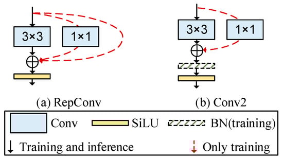 Specifically, during training, the Conv2 module comprises two convolution branches: one with a standard 3 × 3 convolution and another with a 1 × 1 convolution. Let the input feature map be , then the output of this module during training can be expressed as: