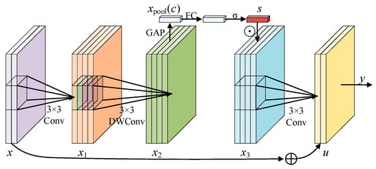 The channel attention module first applies global average pooling (GAP) to the feature  to obtain the channel descriptor (Equation (6)). It then performs a linear transformation on  using a 1×1 convolution and maps the result to the (0,1) interval via the sigmoid function , thereby obtaining the channel weights. These weights are used to perform element-wise weighting of the feature channels in , resulting in the feature . In this manner, the channel attention mechanism reinforces important feature channels, suppresses redundant information, and achieves fine-grained recalibration of the feature maps along the channel dimension: