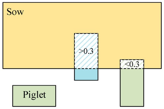 This study focuses on the posture of piglets outside the sow area. Within the sow area, piglets are primarily engaged in nursing-related behaviors; therefore, it is necessary to filter out piglets located outside the sow area. By employing an object detection algorithm to obtain the bounding box information of sows and piglets, the size of the intersection between the piglet and sow bounding boxes is used for discrimination, as illustrated in Equation (7). Piglet targets with bounding box areas not exceeding the threshold Sin are selected. As illustrated in Figure 8, if the piglet’s bounding box area exceeds the specified threshold and lies within the sow’s bounding box (highlighted in orange), that piglet (marked by a blue bounding box) is filtered out. Otherwise, it is retained (marked by a green bounding box) for further analysis: